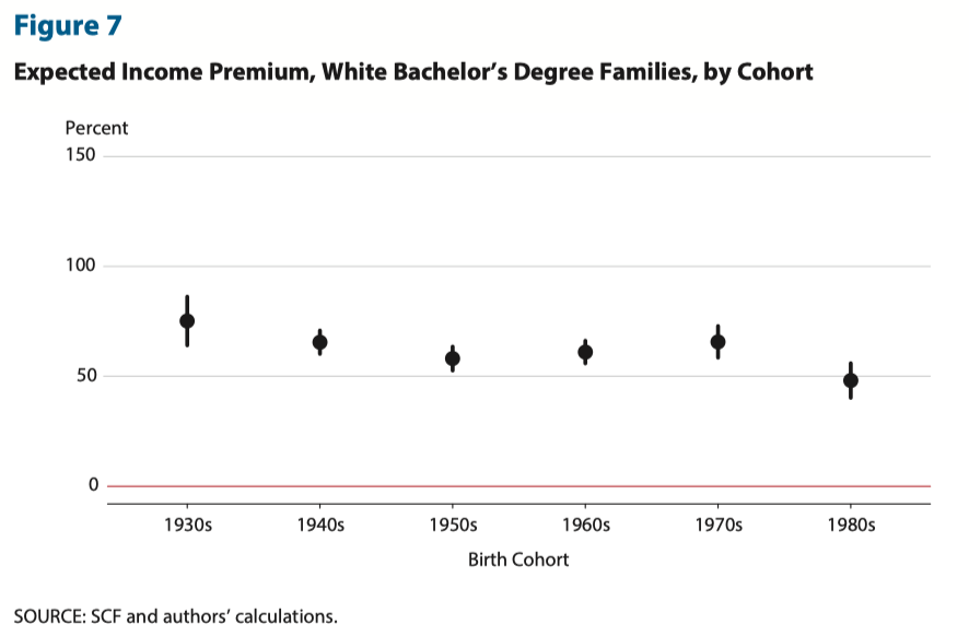 A review of the evidence around higher education shows that the college wage premium is much higher for the overall population. In my favorite study on this topic, researchers at the Federal Reserve Bank of St. Louis show that, controlling for age and level of degree (college vs. graduate), college graduates earn ~50% more than non-graduates (the data is similar for other ethnicities):