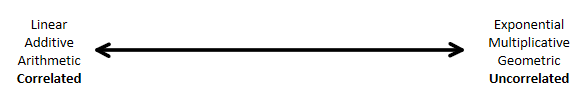 On one side, we have linear/additive/arithmetic/correlated growth, and on the other we have exponential/multiplicative/geometric/uncorrelated growth.